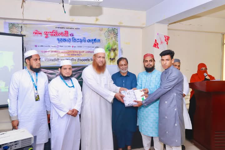 গত ২৫ এপ্রিল ২০২৫, শুক্রবার — ইউনিভার্সিটি অব ক্রিয়েটিভ টেকনোলজি চিটাগাং (ইউসিটিসি)-এর ইসলামিক স্টাডিজ বিভাগ ও ইসলামিক স্টাডিজ ক্লাব “দিশা (DISSA)” এর উদ্যোগে অনুষ্ঠিত হলো ঈদ পুণর্মিলনী ও পুরষ্কার বিতরণী অনুষ্ঠান। অনুষ্ঠানে উপস্থিত ছিলেন বিশ্ববিদ্যালয়ের মাননীয় উপাচার্য প্রফেসর ড. মো. জাহিদ হোসেন শরীফ, রেজিস্ট্রার জনাব সালাহউদ্দিন আহমেদ, ইসলামিক স্টাডিজ বিভাগের কো-অর্ডিনেটর জনাব মো. ওবাইদুল্লাহ্, অতিথি প্রভাষক জনাব মোশাররফ হোসাইন আজহারী, বিভাগের শিক্ষক-শিক্ষিকাবৃন্দ এবং বিভিন্ন বিভাগের শিক্ষার্থীরা। অনুষ্ঠানে সদ্য সমাপ্ত রমাদানে অনুষ্ঠিত “রমাদান কুইজ” প্রতিযোগিতার বিজয়ীদের মাঝে পুরস্কার প্রদান করা হয়। বক্তারা শিক্ষার্থীদের মাঝে ইসলামী মূল্যবোধ চর্চা ও চেতনাকে আরও দৃঢ় করার ওপর গুরুত্বারোপ করেন।