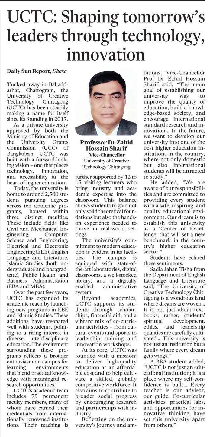 Sadia Jahan Tisha from the Department of English Language and Literature said, "The University of Creative Technology Chit-tagong is a wondrous land where dreams are woven... It is not just about text-books; rather, students' spiritual development, ethics, and leadership qualities are carefully culti-vated... This university is not just an institution but a family where every dream gets wings."